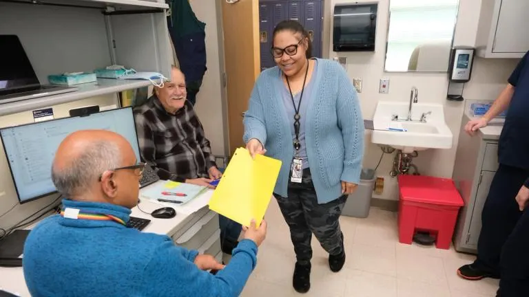 Each morning begins with a brief team huddle that helps align care for the day ahead. These huddles take place at the start of each shift change and bring together LPNs, RNs, physicians, administrative staff, and other clinical staff. When he is on site, primary care physician Dr. Mangrulkar participates in the discussion, focusing on scheduled appointments, anticipated patient needs, and role clarity so everyone on the team is prepared to deliver coordinated care. As Culkowski explains, “We are a detail-oriented team. We look at the needs of our patients, but also at one another’s needs.”
